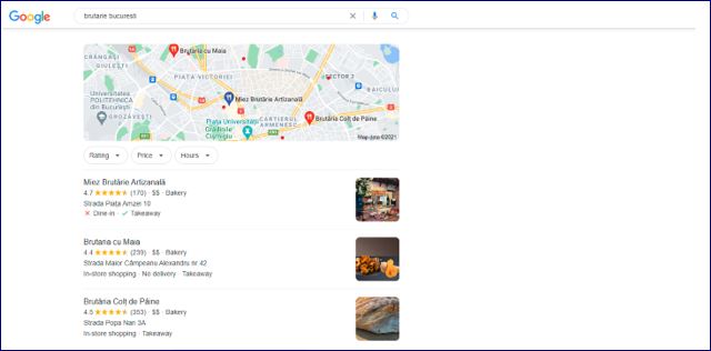Să luăm un exemplu. Dacă o persoană care se află în București, în zona bulevardului Pache Protopopescu, tastează în motorul de căutare Google cuvântul “brutărie București”, Google va genera 3 rezultate organice pentru brutării care au profil înregistrat pe GMB și sunt poziționate în zona Pache Protopopescu.